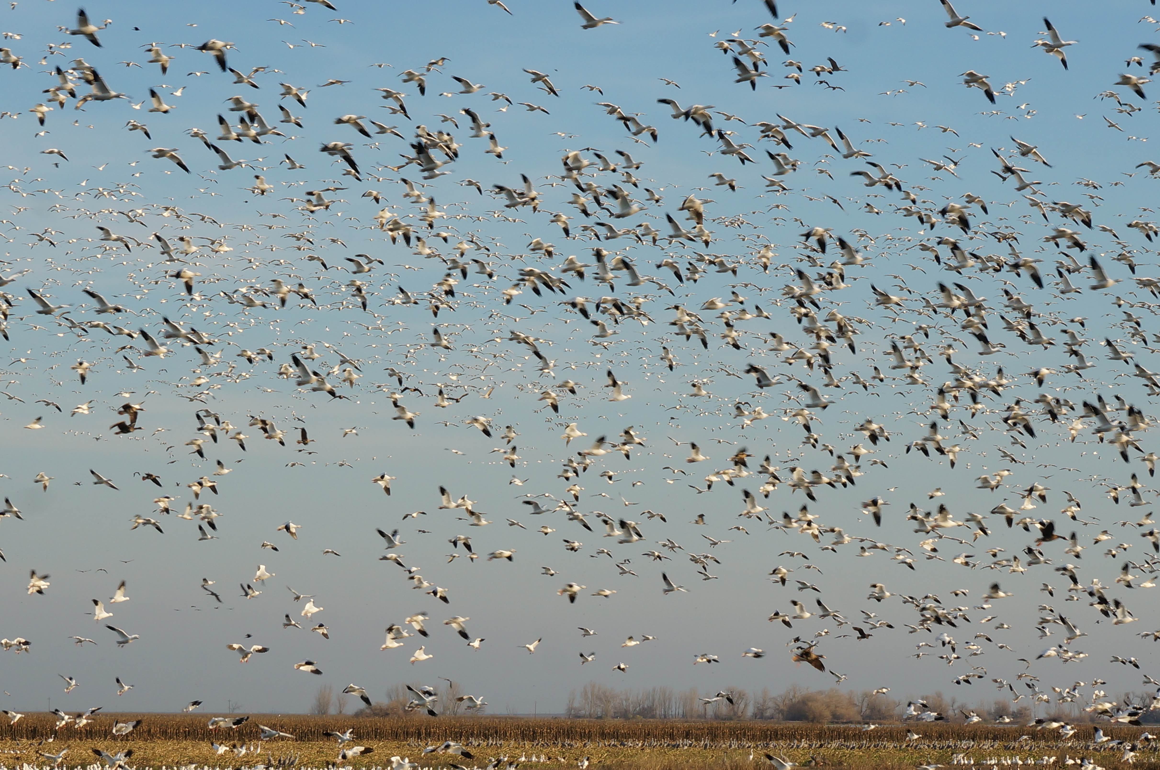 Sandhill cranes and snow geese flocking at dusk